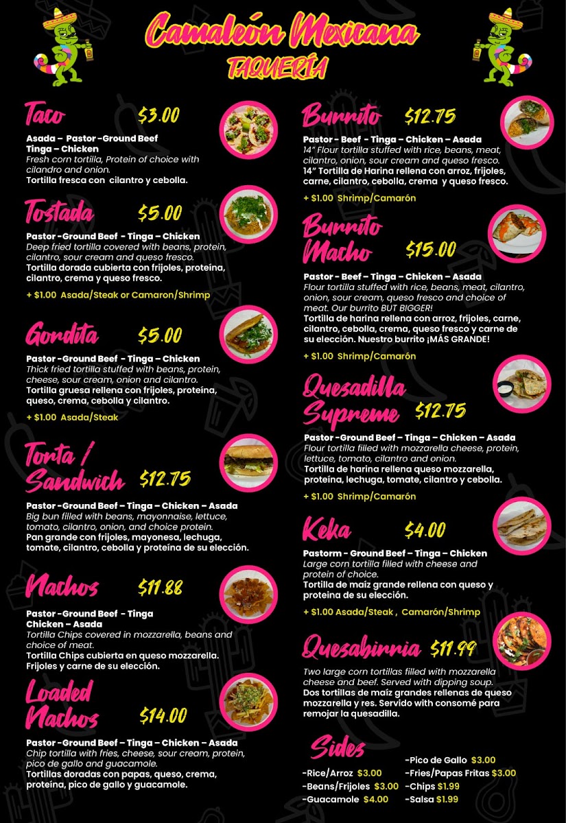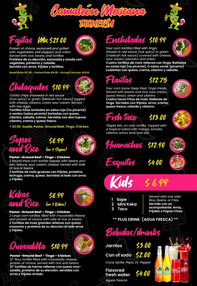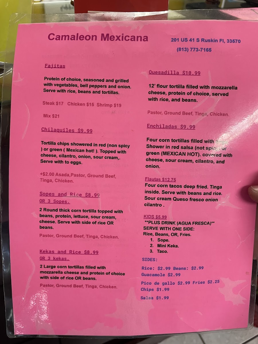 At Camaleon Mexicana, located at 201 S U.S. Hwy 41, Ruskin, FL, you'll find a vibrant and flavorful selection of authentic Mexican dishes that capture the essence of traditional Mexican cuisine with a modern twist. From sizzling fajitas to mouthwatering tacos, each dish is crafted with fresh, high-quality ingredients, ensuring a memorable dining experience. Whether you're craving a hearty burrito, zesty enchiladas, or a refreshing margarita, the menu is designed to satisfy all tastes. The diverse offerings range from classic favorites to more adventurous options, perfect for anyone looking to explore bold flavors. Every meal at Camaleon Mexicana is made with care, promising a delightful treat for your senses.