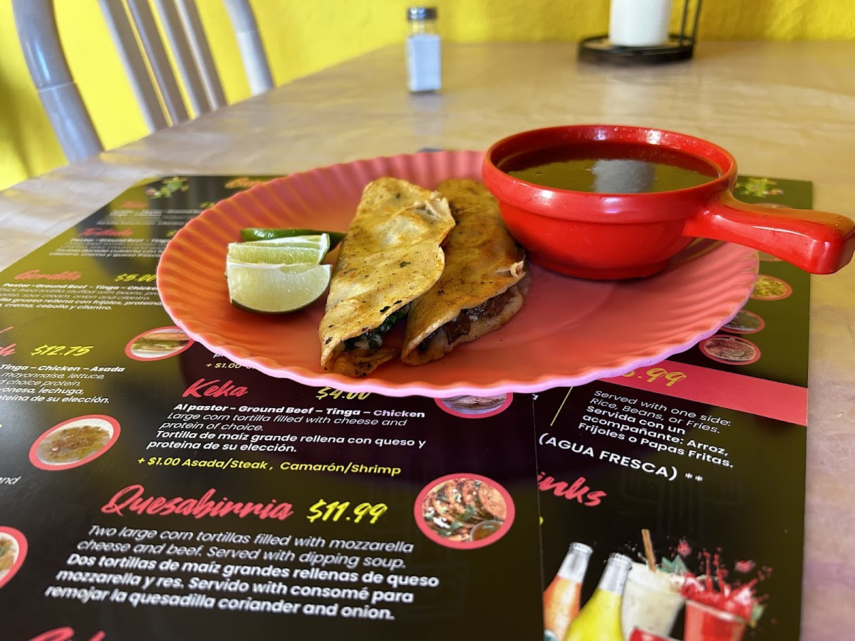 Two large corn tortillas filled with mozzarella cheese, beef, cilantro and onion, serve with dipping soup on side.